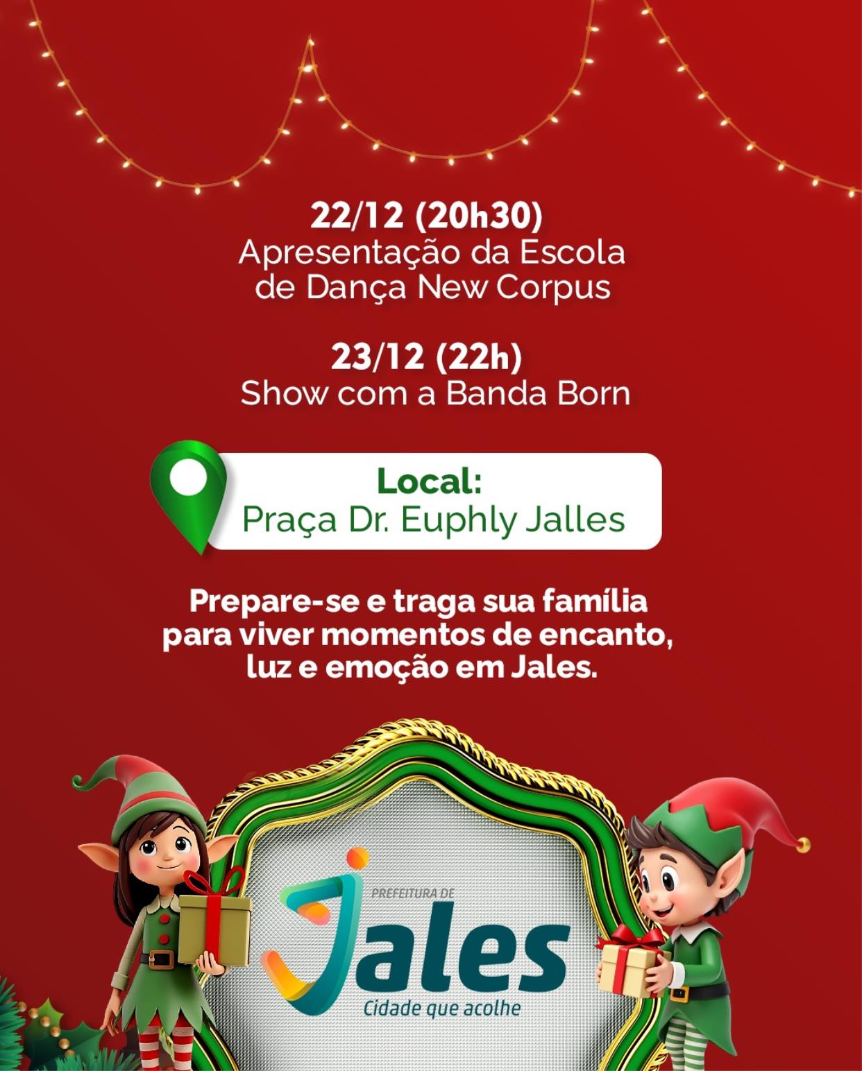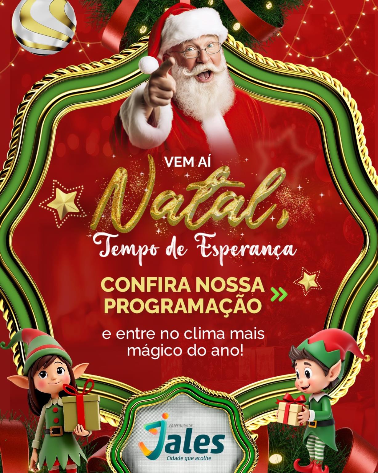 A Prefeitura de Jales, por meio da Secretaria de Cultura e Turismo, divulgou a programação completa do “Natal, Tempo de Esperança 2025”, que promete encantar o público com uma série de atrações musicais, culturais e artísticas, além da tradicional decoração natalina e da presença do Papai Noel. O evento, que já é uma das celebrações mais aguardadas do ano pelos jalesenses, será realizado na Praça Dr. Euphly Jalles.