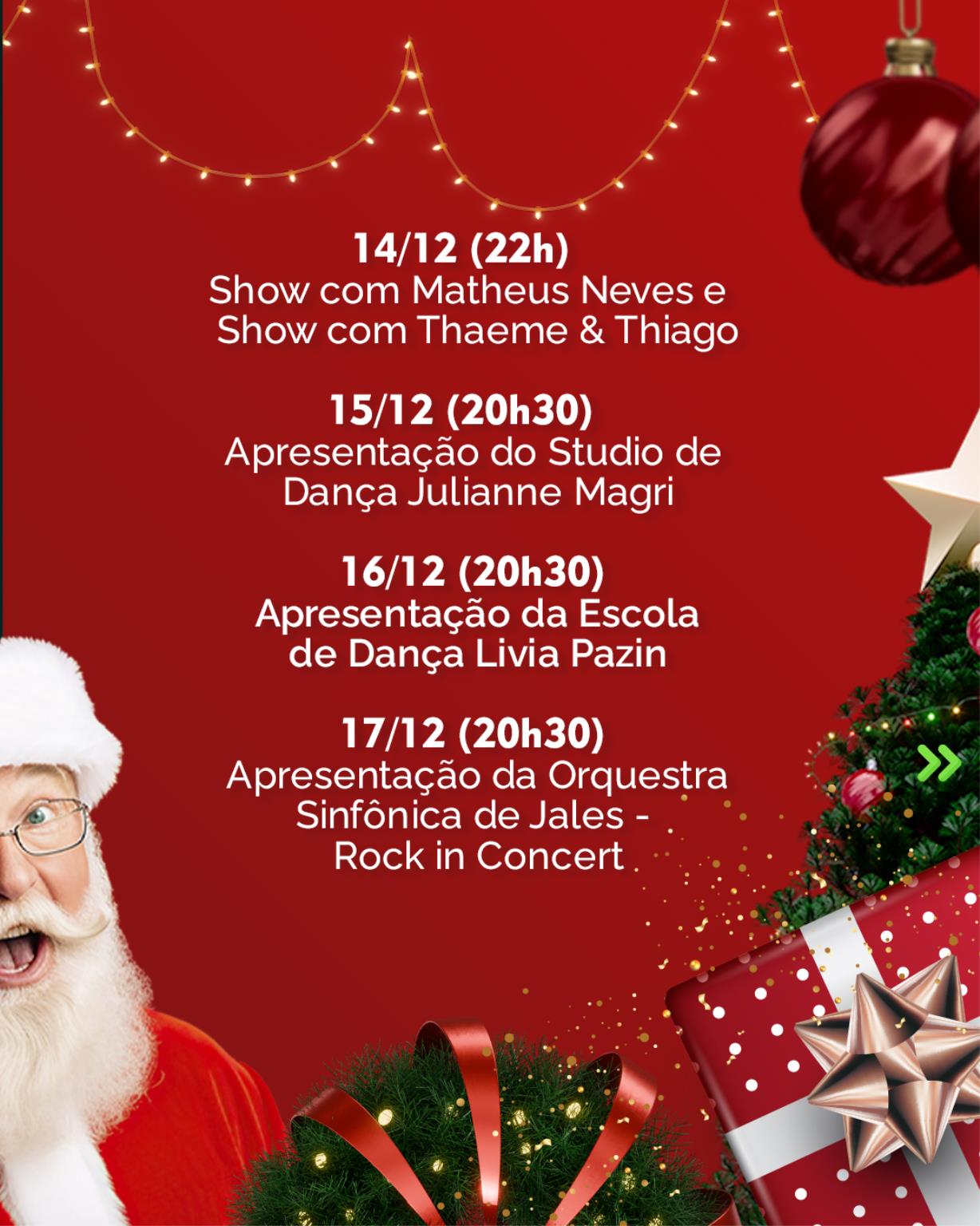 As manifestações culturais também terão destaque no evento. No dia 15, o Studio de Dança Julianne Magri apresentará seu espetáculo especial de Natal, seguido pela Escola de Dança Lívia Pazim, no dia 16. No dia 17, a Orquestra Sinfônica de Jales, levará música de qualidade e emoção à plateia com a apresentação “Rock in Concert”. O dia 18 será dedicado ao espetáculo teatral “Natal, Tempo de Alegria”, e no dia 19, o palco da praça recebe a apresentação “Dominus Session”.
