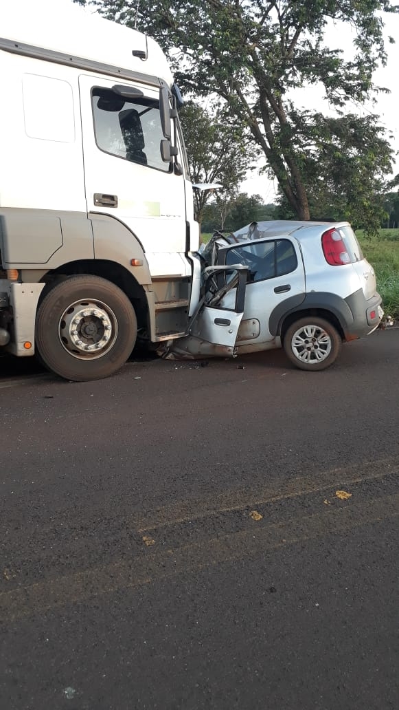 Os dois bateram de frente com uma carreta carrega toras de madeira por volta das 05:30 da manhã deste domingo (19) e faleceram no local.