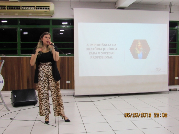O tema foi "A Importância da Oratória para o Sucesso Profissional", abordado pela Professora Doutora, Giovanna Maysa Lima Piacentini; Advogada Especialista em Direito Processual Civil pela Instituiçao de Ensino Damásio Educacional e Coordenadora da Comissão da Mulher Advogada da OAB - São José do Rio Preto.